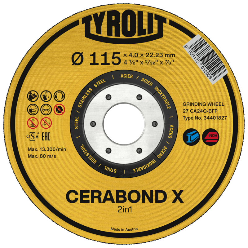 The Tyrolit CERABOND X rough grinding wheel is engineered for demanding grinding work on steel and stainless steel (Inox) using an angle grinder. By combining a revolutionary bonding system with high-performance ceramic abrasive grain, the wheel delivers exceptionally aggressive grinding performance with long-lasting cutting ability.