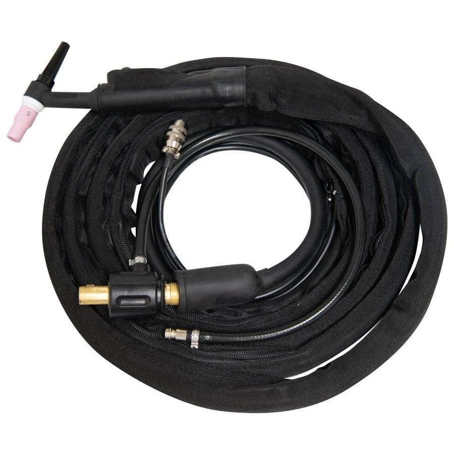 The WP9F-12SP TIG Torch includes a Dix adaptor and 12.5ft cable for flexible welding. Its compact design suits tight spaces, while the durable build ensures longevity. Perfect for precision TIG work, this torch offers comfort and control for professional welders.